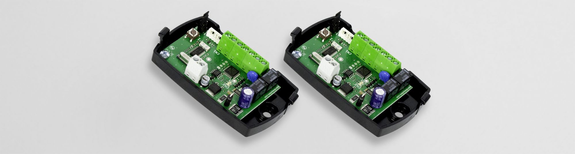 Hardwired 2 channels receiver 433 MHz with capacity to store 1000 transmitters and button assignment independently for each transmitter and relay. Power 24V AC/DC, maximum contact rating 0,5A/30Vdc, supplied with box art.100F (for indoor installation)